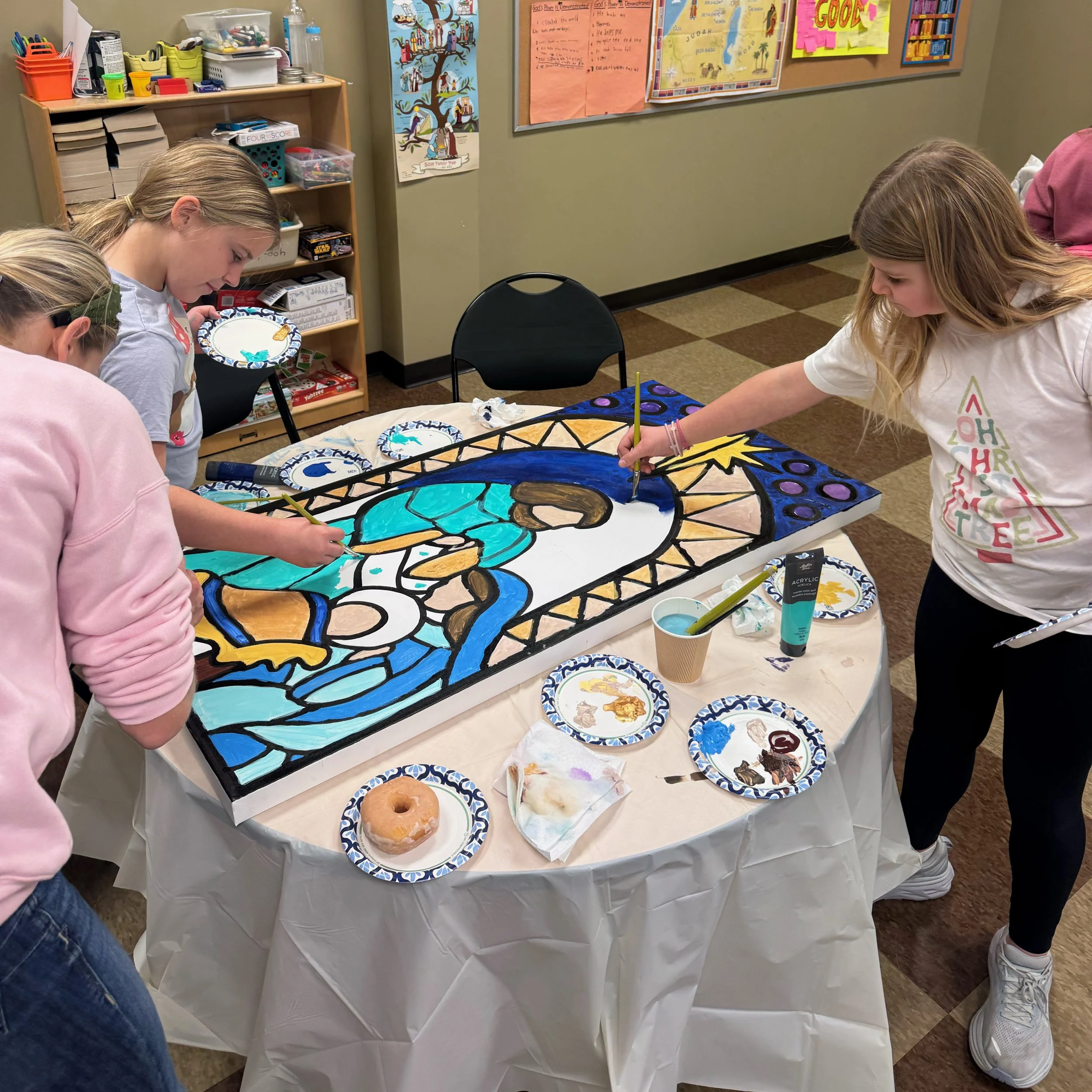 But perhaps the most exciting aspect of this project is how it also served as a catalyst for building and deepening relationships among the students and their families. While the art was a focal point, the real magic happened in the moments of connection between parents and children, and among the students themselves. It created an opportunity for parents to engage with their kids outside of the classroom and church service, encouraging conversations about art, creativity, and faith. It also provided a space for students to build friendships as they worked side by side, united by the shared purpose of honoring the Christmas story through their artistic talents.